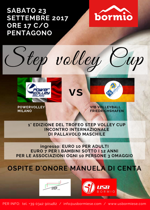 Sabato 23 settembre a partire dalle ore 17 presso il Palazzetto dello Sport del “Pentagono” in Via Manzoni, si disputerà la Prima STEP VOLLEY CUP, un incontro di PALLAVOLO tra le due formazioni del POWERVOLLEY MILANO che milita nel campionato italiano di Serie A1 guidata dall’allenatore ed ex campione Andrea GIANI, e la VfB VOLLEYBALL FRIEDRICHSHAFEN (già vincitrice della CEV European Champions League e pluricampione nella massima serie del campionato tedesco, Bundesliga).