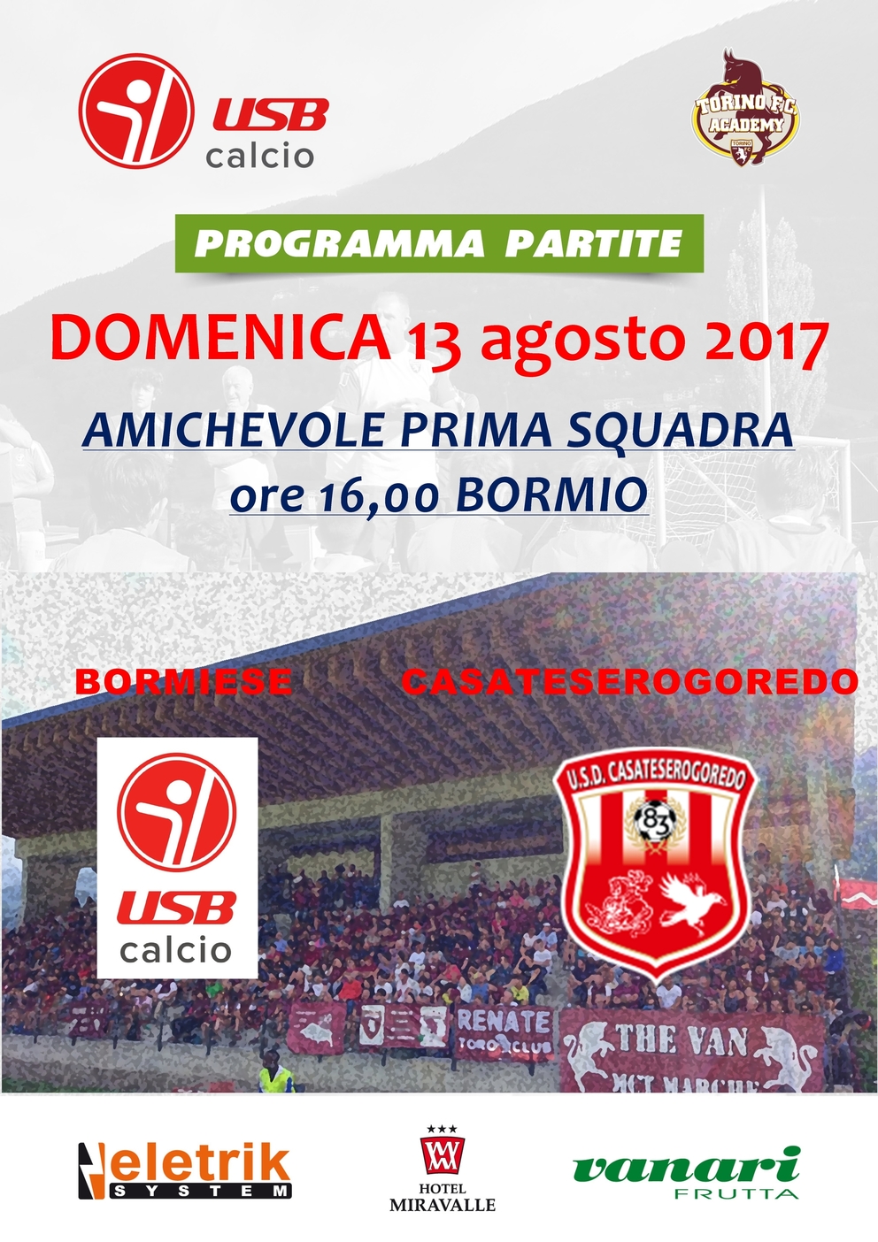 Domenica 13 agosto prima uscita stagionale per la Bormiese Calcio di Mister Davide Menegola, rinforzata dopo il passaggio in Seconda Categoria con gli innesti di Paganini e Verona dalla Tiranese e Rocca e Cusini dalla Livignese. La Bormiese non può pretendere molto da questa partita contro un avversaria di Eccellenza, ma sarà sicuramente utile per l’amalgama del gruppo con i nuovi arrivati. Ricordiamo che la Casateserogoredo ha affrontato il Torino di Capitan Belotti durante il ritiro estivo precampionato che i granata hanno svolto a Bormio, uscendo a testa alta contro i forti avversari, partita terminata con la vittoria per 5-0 della squadra di Mister Sinisa Mihajlovic. Soprattutto sarà l’esordio per la nostra squadra nel rinnovato stadio comunale, dotato ora di confortevole tribuna coperta. Attendiamo numerosi tifosi a vedere la nuova Bormiese 2017/18 e a provare i nuovi spalti!