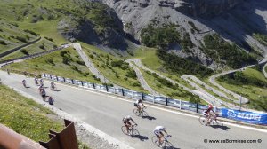 Primo tornante verso lo Stelvio: ce sono altri 39 da superare, ciascuno ricorda un campione o un grande momento della storia della mitica squadra Mapei di ciclismo. [ZFP_PhotoSet id=p353149410]