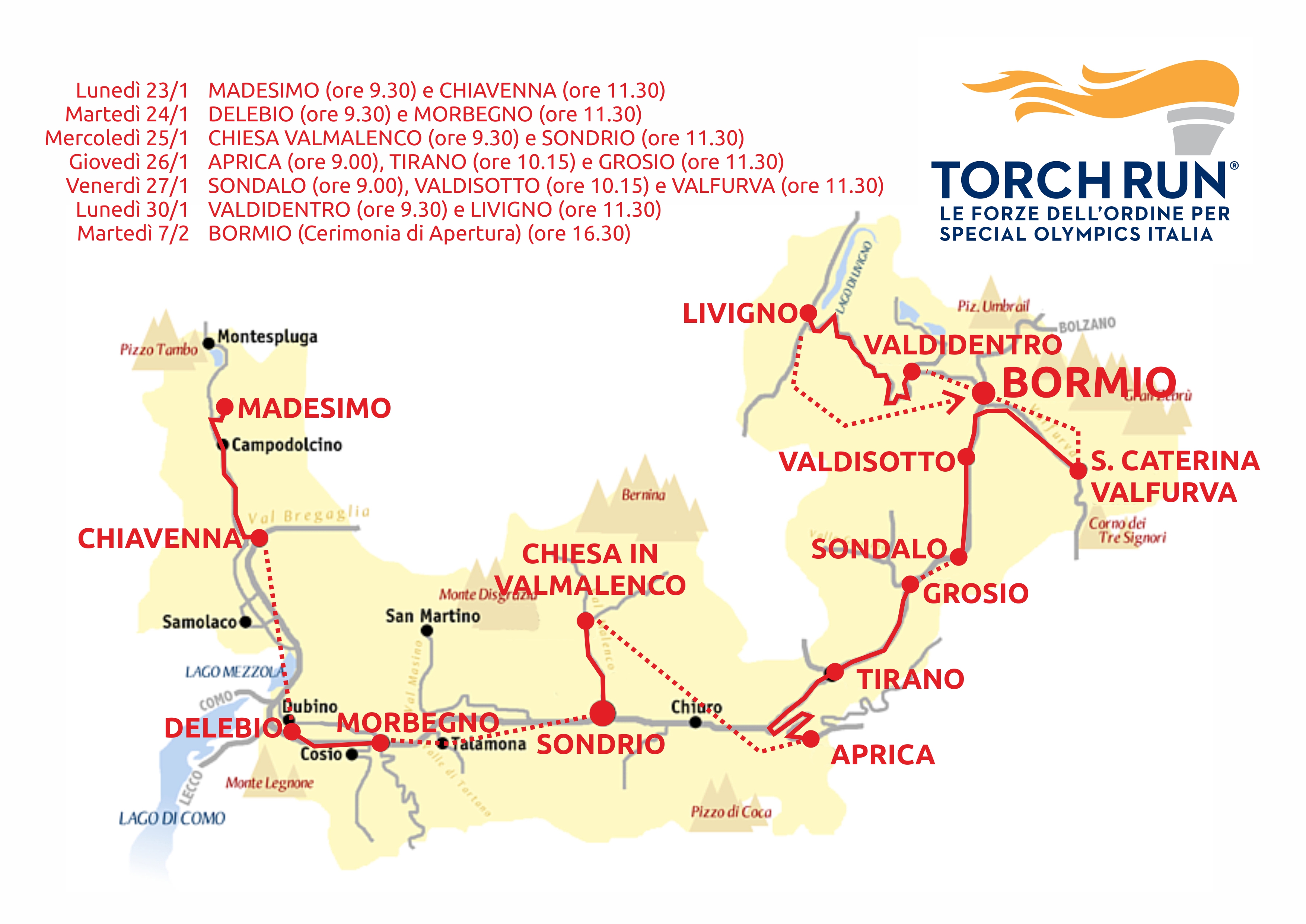 Il “Torch Run”, questo e’ la denominazione dell’evento apripista dei Giochi, vedrà un gruppo di tedofori, costituito da componenti le Forze dell’Ordine e appassionati locali di podismo, portare la torcia da un Comune all’altro, richiamando l’attenzione della popolazione al fine di coinvolgerla attivamente nei Giochi Nazionali invernali.