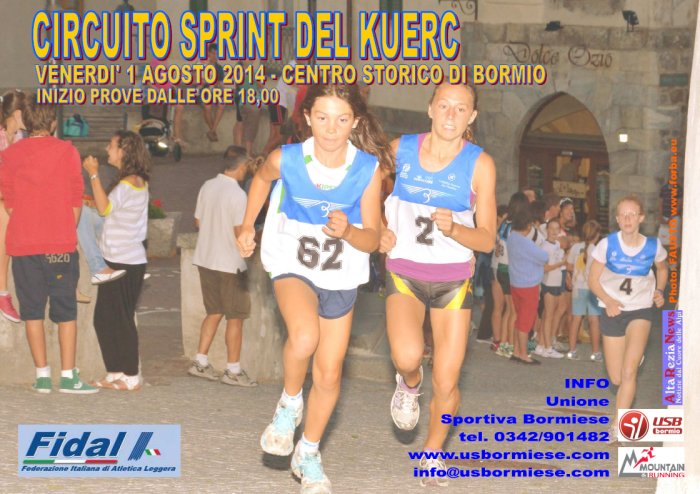 L'Unione Sportiva Bormiese organizza venerdì 1° agosto 2014 la manifestazione podistica denominata SPRINT DEL KUERC, gara su strada provinciale, valida come 9^ prova del Trofeo Giovanile Credito Valtellinese. Alla prova sono ammessi i tesserati FIDAL per l’anno 2014 per tutte le regioni d’Italia. Le categorie ammesse saranno le seguenti: ESORDIENTI B e C M/F 2005/2008, …