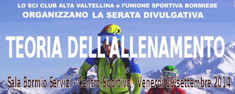Venerdì 19 settembre 2014 alle ore 20.30 presso la sala riunioni Bormio Servizi (di fianco agli uffici dell'Unione Sportiva Bormiese), con l'organizzazione curata dal settore SKI ALP dello SCI CLUB ALTA VALTELLINA e con la collaborazione dell'UNIONE SPORTIVA BORMIESE, verrà organizzata una tavola rotonda sulla TEORIA DELL'ALLENAMENTO. La serata sarà tenuta dal preparatore atletico EROS …